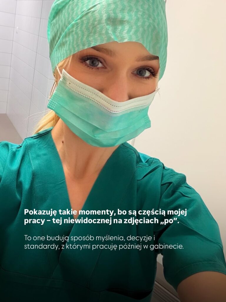 Dzięki doświadczeniu szpitalnemu jeszcze bardziej świadomie pracuję z klientkami. Rozumiem ciało jako całość, a nie zbiór „obszarów do poprawy”. Mam ogromny szacunek do procesów gojenia, regeneracji, do indywidualnych reakcji organizmu. Procedury, higiena, aseptyka, bezpieczeństwo – to przestaje być teorią, a staje się naturalnym standardem pracy.